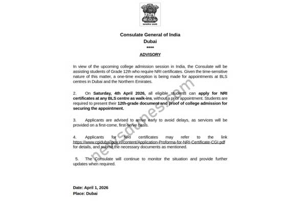 രാജ്യത്തും ചുറ്റുപാടും നിലനിൽക്കുന്ന പ്രത്യേക സാഹചര്യത്തിൽ ഡിഗ്രി പഠനത്തിനും മറ്റു ഉപരിപഠനത്തിനുമായി ഭാരതത്തിലേക്ക് പോകാൻ ഉദ്ദേശിക്കുന്ന പന്ത്രണ്ടാം ക്ളാസ് കഴിഞ്ഞ കുട്ടികൾക്ക് NRI സർട്ടിഫിക്കറ്റുകൾ പെട്ടെന്ന് ലഭിക്കുവാൻ യു എ ഇ യിലെ ഇന്ത്യൻ എംബസ്സിയും ദുബായ് ഇന്ത്യൻ കൗൺസിലേറ്റും ഈ വർഷം പ്രത്യേക സംവിധാനം ഒരുക്കിയിരിക്കുന്നു.